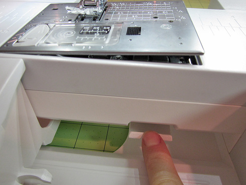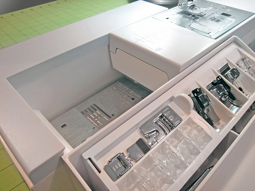 We love how Janome provides an area to store all the standard accessories that come with the machine right in the bed where they are easy to access. When this extension table/storage compartment is removed, you have free-arm capability – perfect for sewing cuffs, smaller projects, etc. The photo below shows the compartment about half way off.