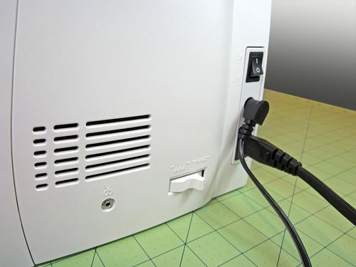 On the side of the machine, in addition to the blue accented hand wheel, is where the power cord and foot control are connected. This is also where you find the on/off switch and drop feed lever. Often, this lever can be tucked away in a hard-to-reach place. Not on the Skyline. We really liked how the drop feed lever was so easy to access and use.