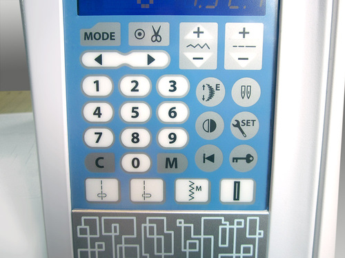 Now for the focal point of the machine. The touch panel can be operated by finger touch or with the provided stylus. It displays buttons for changing stitch mode, adjusting stitch width and length, and programming the lower thread cutter. There are cursor keys for creating stitch patterns, and easy navigation indicators for stitch selection, elongation, twin needle compatibility, mirror image, general settings, start-over-in-a-stitch pattern, memory, and direct pattern selection. There’s even a lockout key for safety purposes.