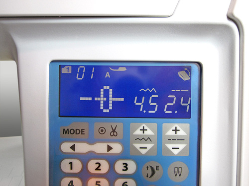 Computerized sewing machines are preprogrammed to default to specific settings depending on the stitch selected. What does this mean exactly? When a stitch is selected, the machine will automatically adjust to a specific width and length for optimal stitch results. For instance, the center needle straight stitch or stitch #1 (in Mode 1) will default to a stitch width of 4.5 (which is dead center of 9mm) and a stitch length of 2.4 (which is an average stitch length or halfway to the 5mm maximum stitch length).