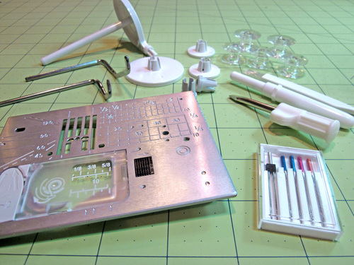 - Basics – extra bobbins, needles, lint brush, screwdriver, seam ripper.