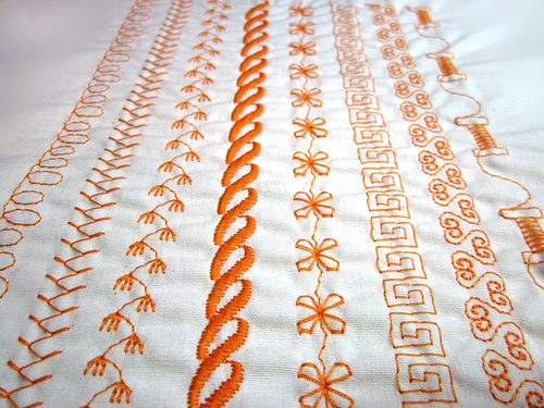 For example, you use the elongation command (or key) with satin stitches. When pressed, it automatically adjusts the overall length of the specific satin stitch selected in set increments, which is shown on the LED screen. The elongation ratio is from L1 (original length) to L5. This function provides additional creativity; it’s like getting whole extra set of decorative satin stitching. Below is Stitch #70 (Mode 1) elongated from its original length to L5.
