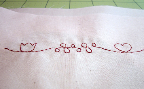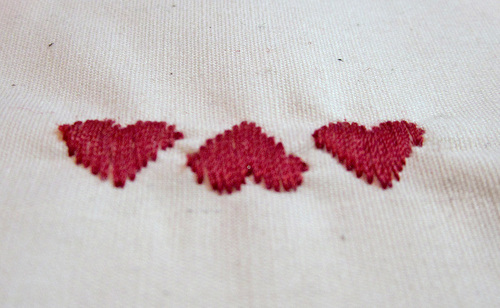 The mirror image key will flip a design horizontally. You wouldn’t choose this for something like a straight stitch, because it would look exactly the same in its mirror image. Use it instead on stitches with a specific direction, such as heart stitch #47 (Mode 2). In our example below, the heart in the middle has been mirror imaged. Once again, this expands your overall stitching and embellishing options.