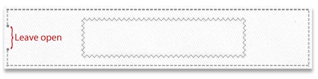 - Using a ½” seam allowance, stitch around the three sides, pivoting at the corners. Stitch back and forth several times across the tab to reinforce it in the seam. Also, remember to leave that opening at the center of one side and to lock your stitch at either side of the opening.