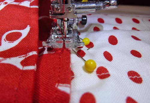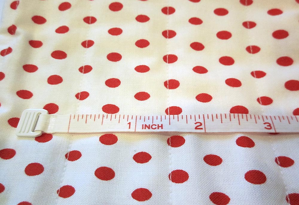 - Lengthen the stitch to match the quilting you did on the main panel. Using either a matching or a contrasting thread (we used white thread against the red fabric on one sample and matching thread on the other sample), stitch along each drawn line from the bottom raw edges to the top seamed edge of the pocket.