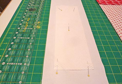 - Place the 7″ x 27½” batting piece flat on your work surface. Place the 7″ x 27½” main fabric piece right side up on top of the batting. Pin together the layers around the perimeter.