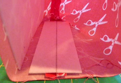 - Using this drawn line as a guide, slide one piece of stabilizer inside the sewn thread catcher. The drawn line should match-up with the sewn side seam.