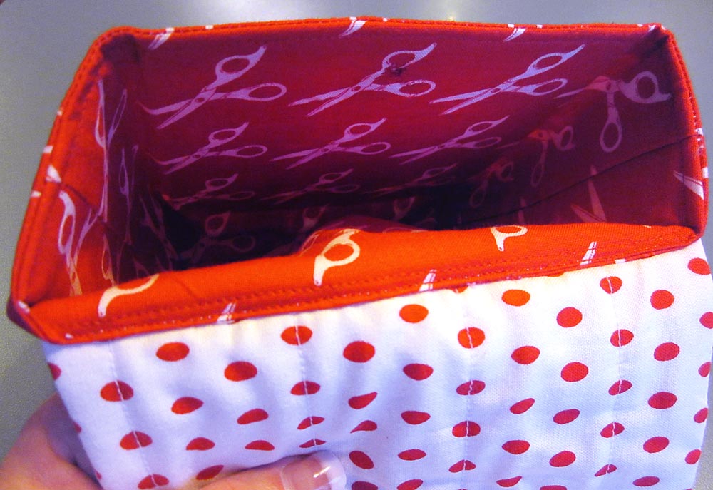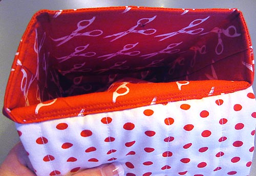The middle strip on the caddy is there to anchor the pocket panel and the thread catcher, but it is also clever in its own right. We added a layer of batting underneath the pretty fabric so you can stick pins into this center section as well as into the detachable pincushion.