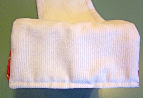- Turn the thread catcher right side out through the opening, being careful as you bend the stabilizer to snake it through. It will be a little tricky to maneuver, but if you fused it well, it will bend just fine.