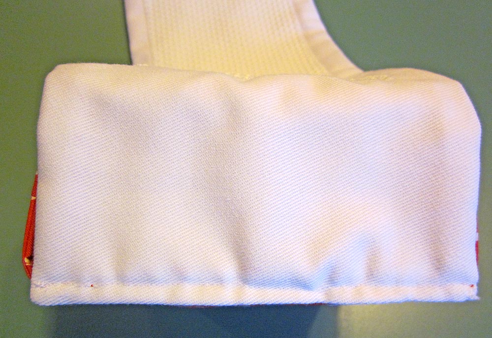- Following your machine’s manual, make a vertical buttonhole at the bottom the tab (the finished end) to match the size of the button on the thread catcher. Place the buttonhole ¼-½” up from the finished end and center it side to side.