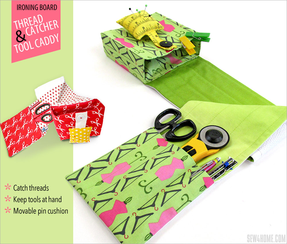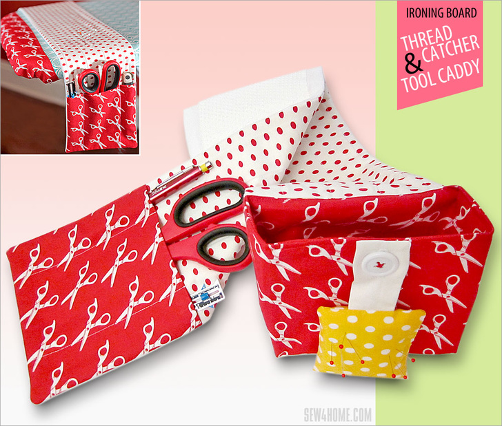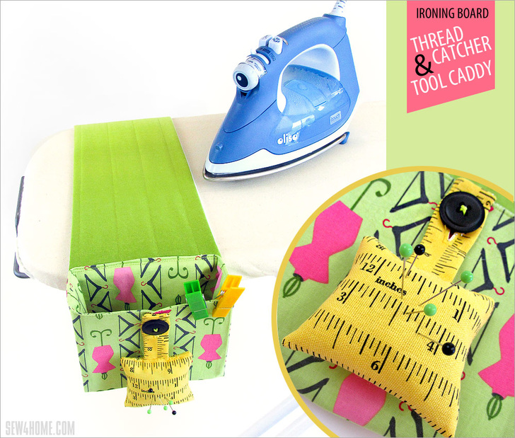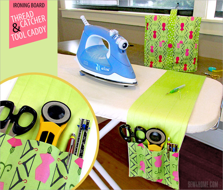 During any given project, you’re likely to log at least five miles running back and forth between the sewing machine and the ironing board. Crap… need another pin. Dang… where are my scissors? Shoot… forgot to grab the seam gauge again. Sound familiar? We decided your taken-for-granted ironing board was in desperate need of its very own notions caddy. Of course all this fabulous organization means you will now have to make up that five miles with extra laps on the treadmill.