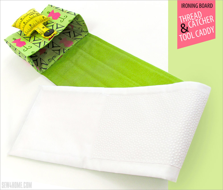 This caddy is designed to lay across the wide end of a standard 15″ wide ironing board, which should be perfect for most standard ironing boards. It also can fit nicely on the side extension of a sewing table. Measure your ironing board prior to starting to see if you need to adjust the panel shorter or longer.