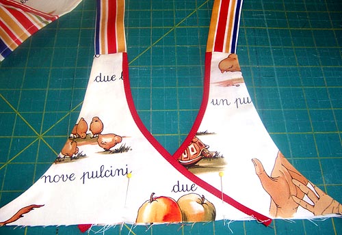 10. Leave about a 12-13″ opening in the top of the waistband/ties to insert the apron top and about a 19-20″ opening for the skirt.