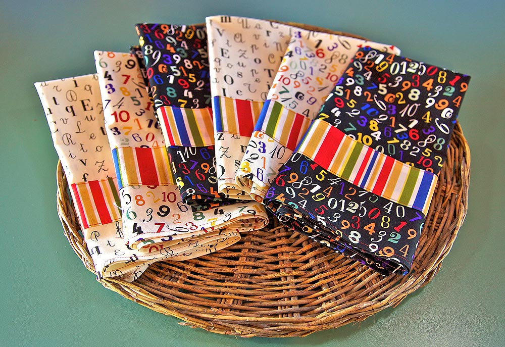 To further confound your brain, we used three different fabrics to create our four napkins. At our imaginary table, Mom’s and Dad’s napkins match in Black Numeri Piccolo. Then, there is a slightly different design for each of our imaginary kids: two in Cream Numeri Piccolo and two in Cream Alfabeto Piccolo. Each napkin has the same coordinating stripe so they all go together beautifully. We are lucky enough to have lots of fabric to work with and so love to mix and match. If you want to conserve fabric, the easiest thing to remember is: ¾ of a yard will make two 20″ x 20″ finished napkins. Increase to 1¼ yards to make a matching set of four napkins.