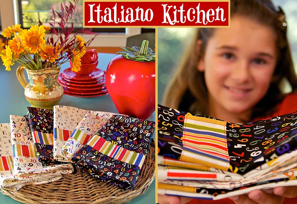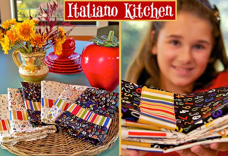 All the projects in our Italanio Kitchen series use a wonderful new fabric collection from our friends at Michael Miller Fabrics: Alfabeto Italiano Collezione. You’ll find it online and in stores now.