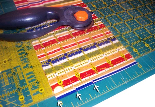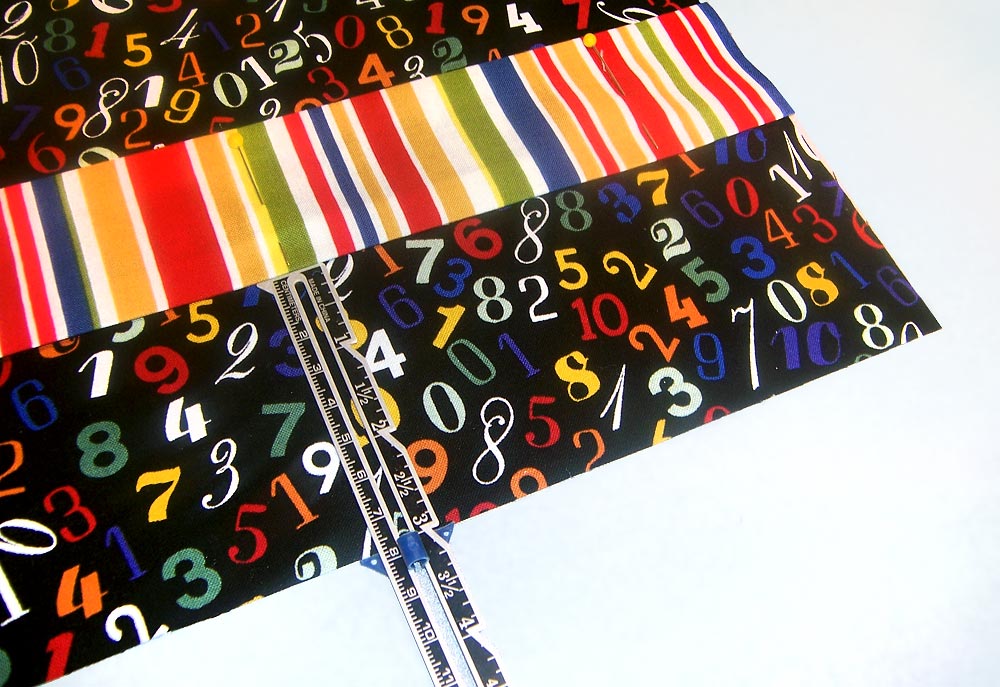 - From the fabric for the contrasting stripe (Cha Cha Stripe in our sample), cut TWO strips 3″ x Width of Fabric (WOF). Cut each strip in half, then trim about 1″ from the selvedge ends to create four pieces 3″ x 21″.