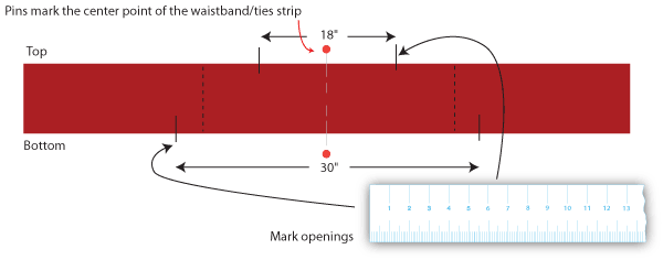 6. Using your see-through ruler and fabric pencil, measure and mark the openings needed in the waistband to insert the apron bib and apron skirt. You can fold the strip in half to find the center and mark it with a pin to help insure the openings are perfectly centered. You need a 18″ opening along the top of the waistband and a 30″ opening along the bottom of the waist band.