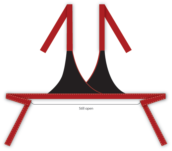 12. Insert the bib into the top opening (the 18″ opening) of the waistband. Pin in place.