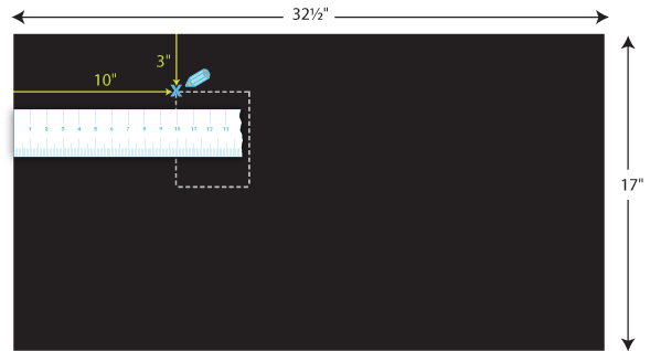 8. Place the Right Skirt Panel (main fabric, 32½” x 17″ piece) right side up and flat on your work surface so you can mark it for pocket placement. With your fabric pen/pencil and see-through ruler, mark 10″ in from the outside edge of the skirt (the left edge as you look at it) and 3″ down from upper edge. This point will be the upper outside corner of the pocket.