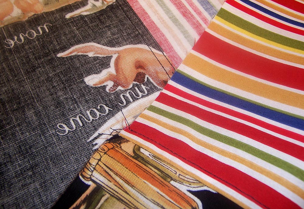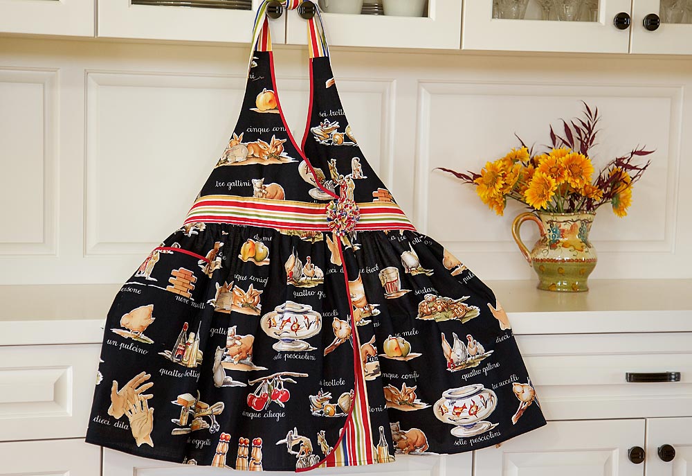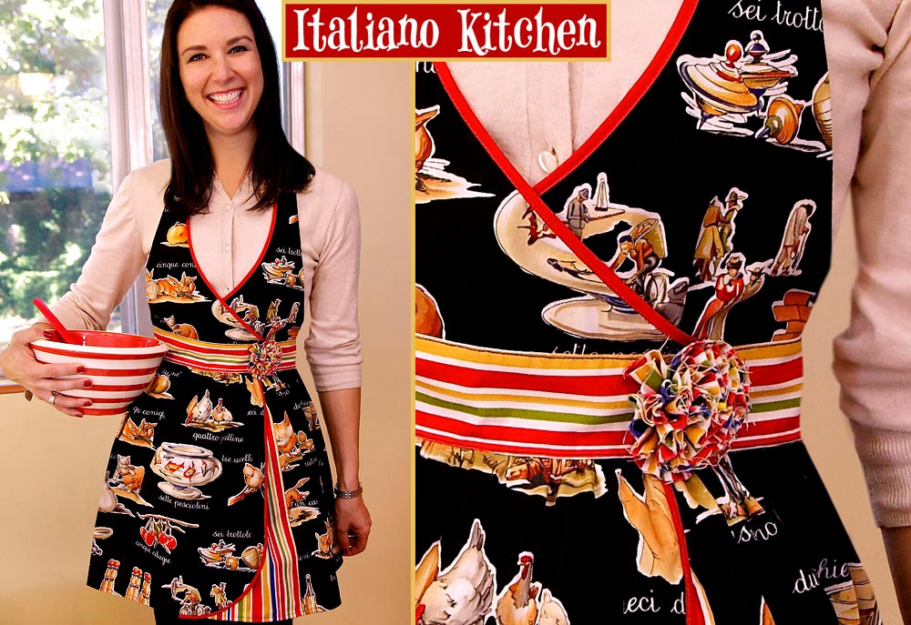 We love aprons here at Sew4Home. So we knew our Italiano Kitchen would not be complete without them. In fact, it would not be complete without two of them: one for Mama and one for Bambina (it debuts tomorrow). Inspired by those wonderful 1960s dresses Sophia Loren wore in her movies, our apron design combines a lovely wrapped front with a full, peek-a-boo skirt. It looks oh-so sophisticated and rather complex to make. But… no tears, no drama, no throwing of plates. In true S4H-fashion, we keep the sophistication, but lose the complexity. Construction is step-by-step easy.