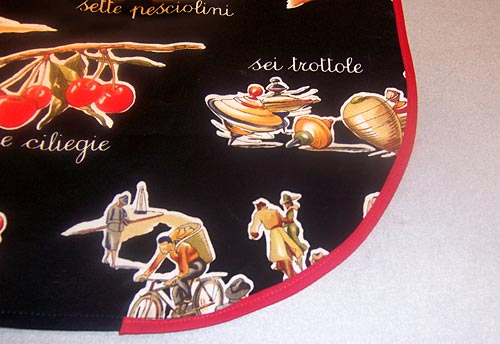 6. The inside edge of the Right Skirt Panel is still raw. The lower inside corner of this panel needs to be rounded to create the peek-a-boo overlap. To do this, use a large bowl or plate as a template. Place the bowl/plate at the corner, and trace around the outside edge, blending your curved line into the straight lines of the side and bottom. Trim along the marked line. Yes … you will be trimming off a bit of your lower edge hem; that’s okay, we’ll bind over it.