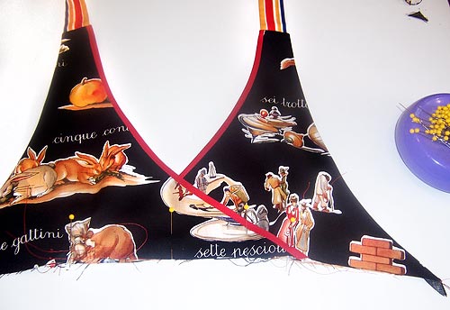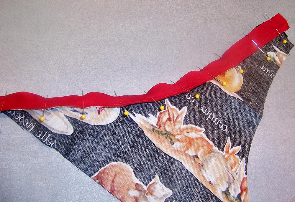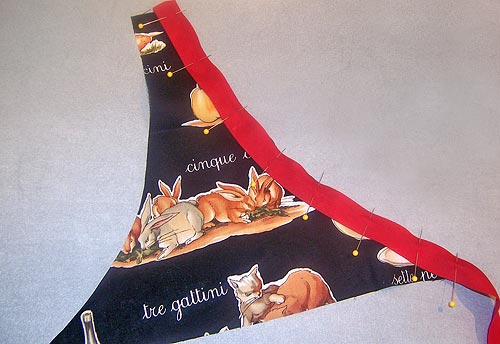 5. Pin one strip of bias binding right sides together along the inside edge (the curved edge) of one Apron Bib piece.