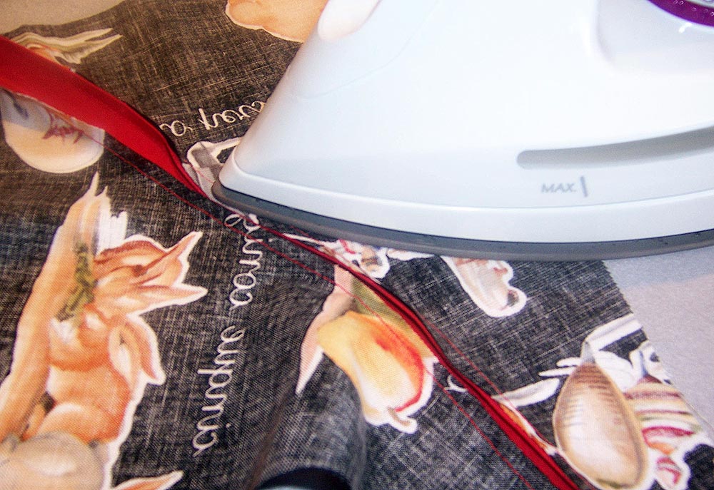 13. Turn right sides out through the bottom edge and press well. You’ve created a lovely bound edge along the front curved edge of the bib and a continuous look to the top of the apron and the tie.