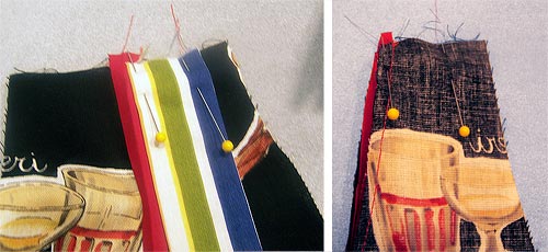 2. Trim the corners and turn right side out. Press. Finish the upper edge with bias binding, turning under the ends of the bias binding so they are even with the finished sides of the pocket.