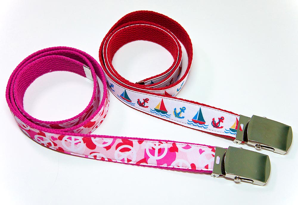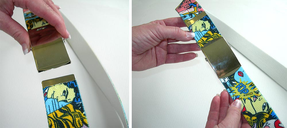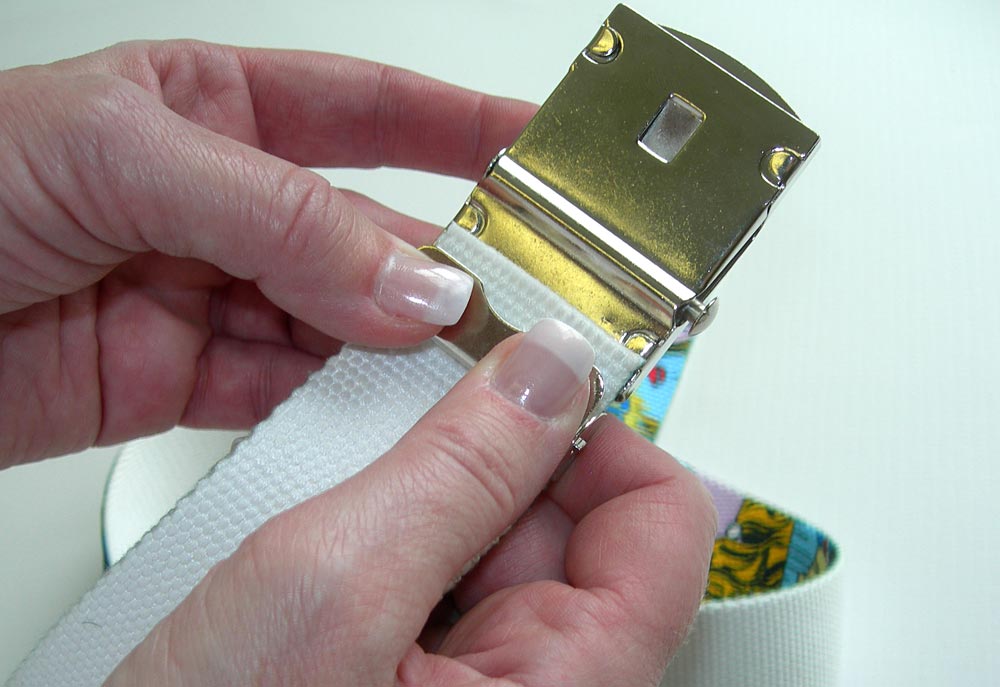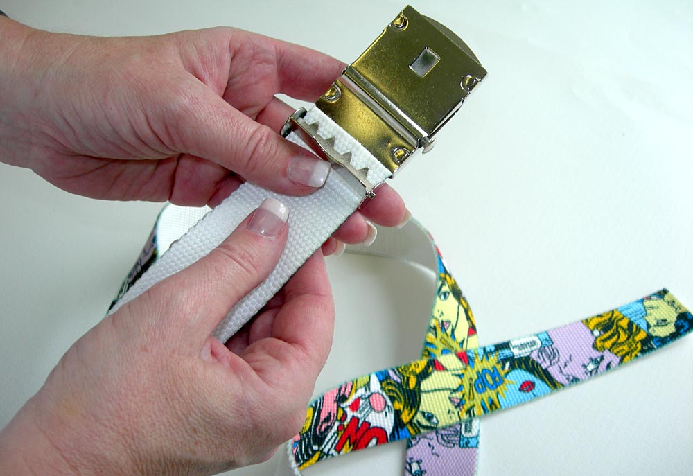 - Once you determine direction, check again and make sure any pattern on the belt is going the right way. Our webbing was printed with fun cartoons, which we wanted facing heads up.