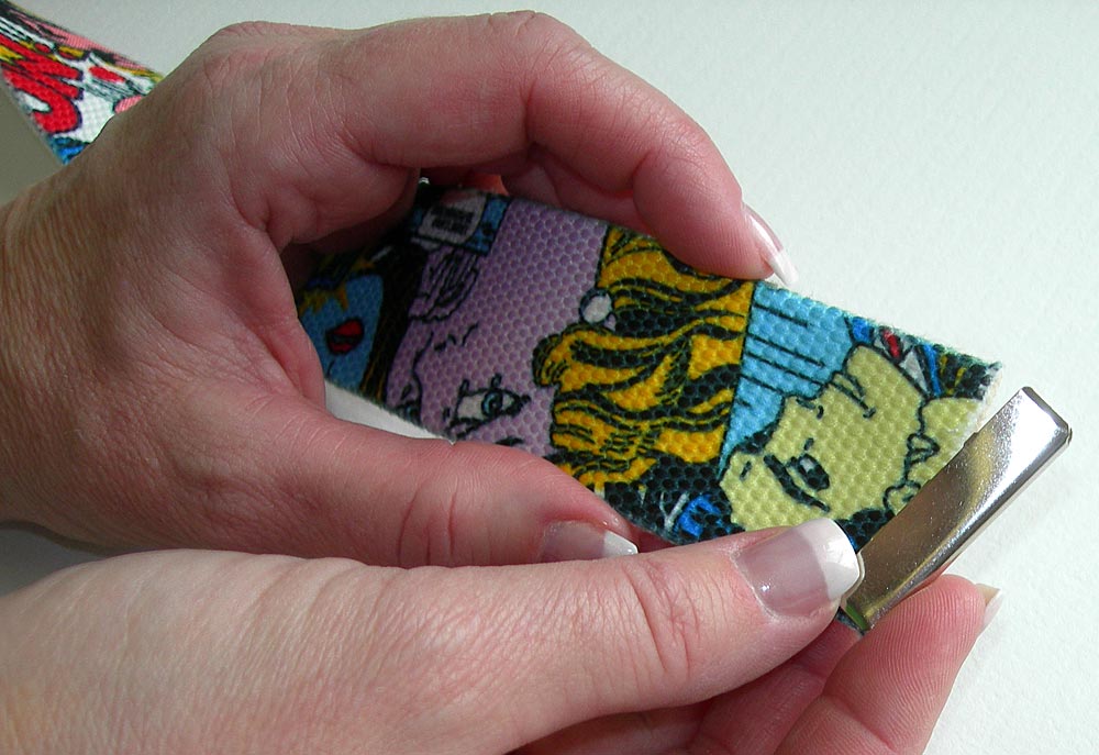 - Slip the end tab onto the opposite raw end of the webbing. Make sure you slide the webbing all the way in to the tab so the raw edge rests against the inside ‘fold’ of the tab.