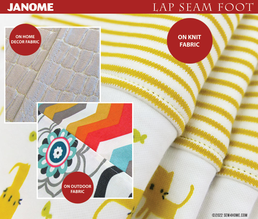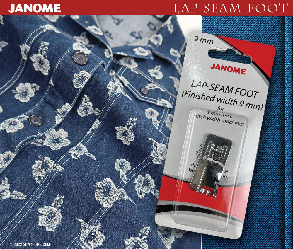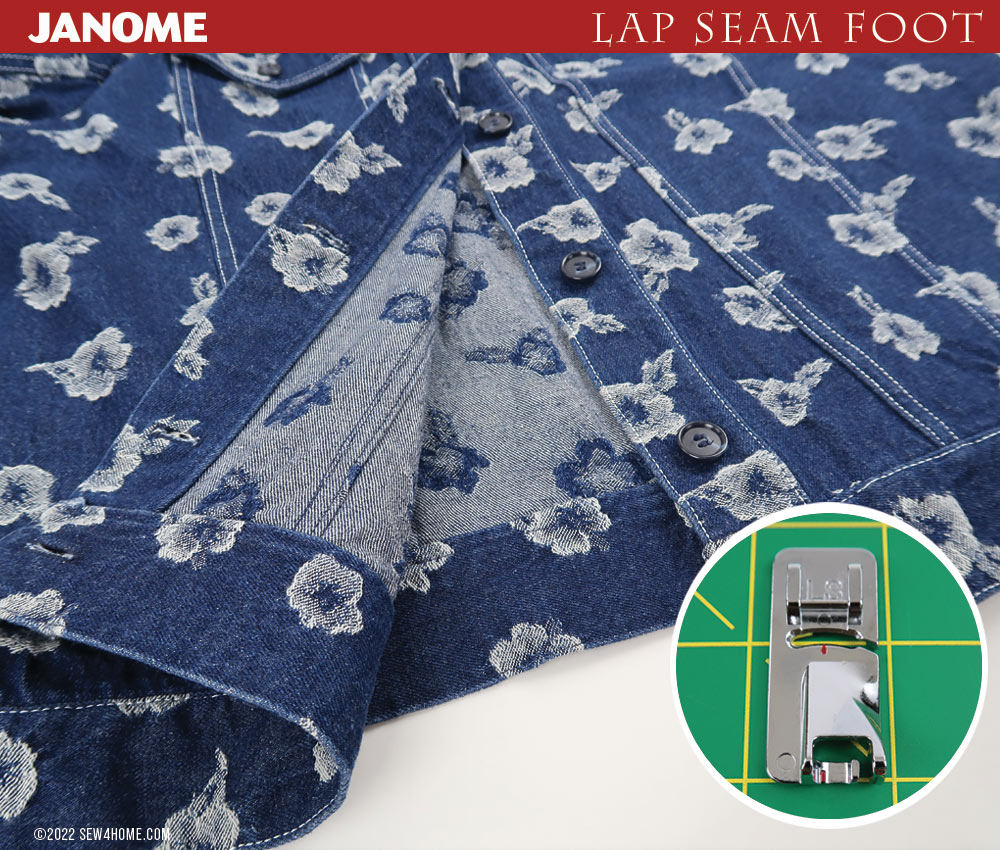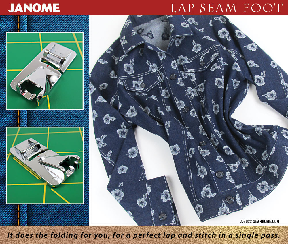 The Janome Lap Seam Foot is designed to roll the seam allowance to the inside and edgestitch it in place at the same time.