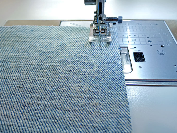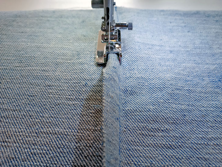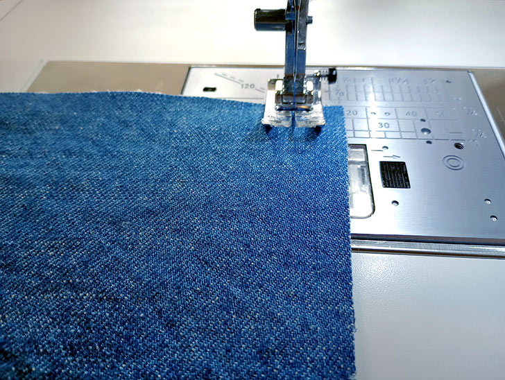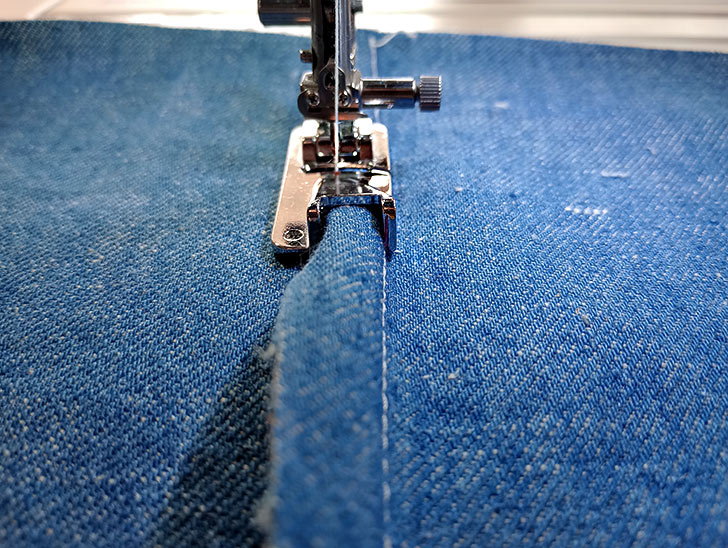 The foot is designed for Janome machines with a top loading bobbin and a 9mm stitch width. It is recommended for medium to heavy-weight fabrics, such as denim, cotton canvas, cotton duck, and outdoor fabrics. If you have a different type of fabric or are simply interested in how to create both outside and inside flat felled seams, take a look at our traditional step-by-step tutorial.
