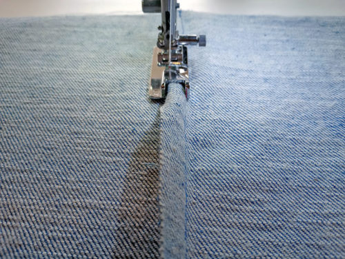 - Stitch a ⅝” seam. We used a thicker topstitching thread in both the bobbin and the needle and sewed this initial seam with the standard A foot. The stitch length was 3.0mm.