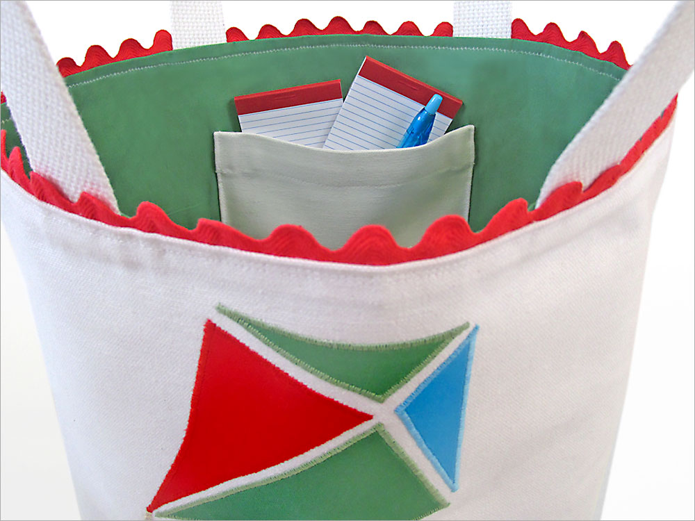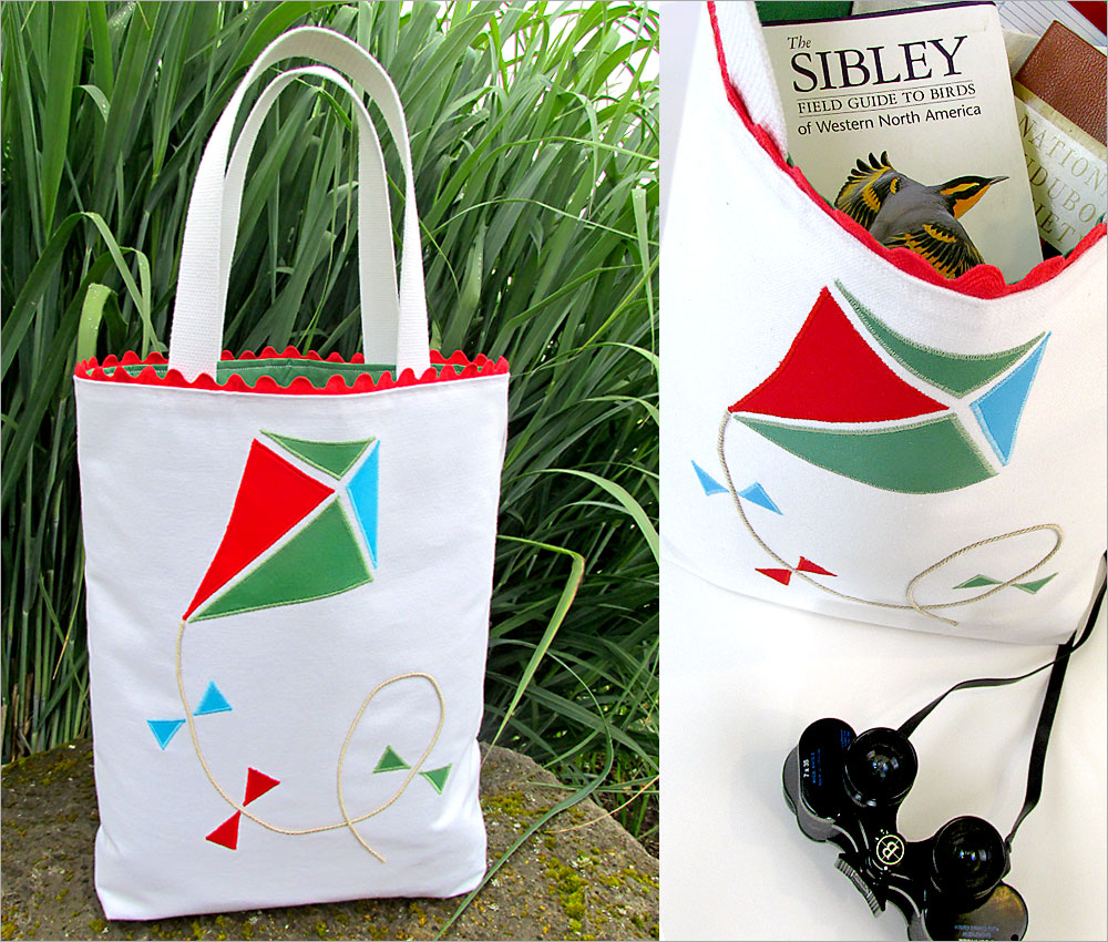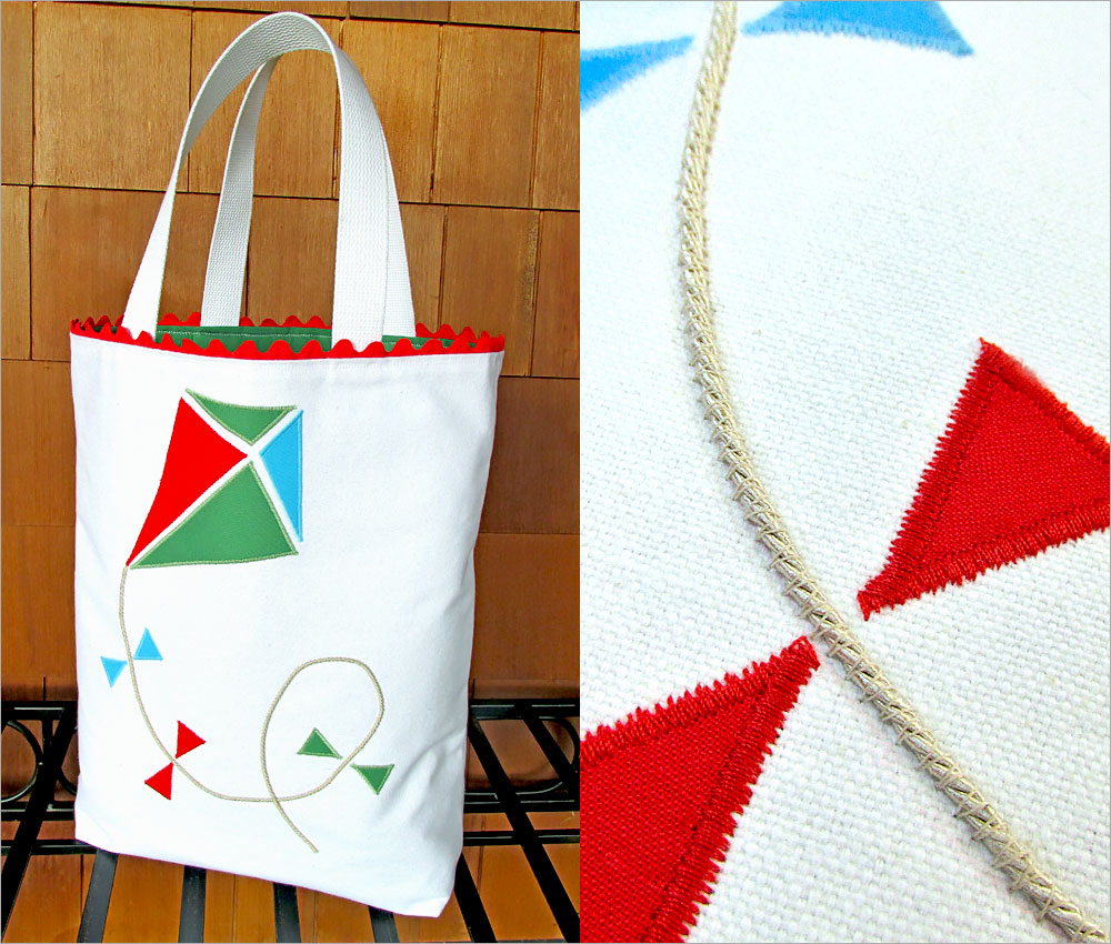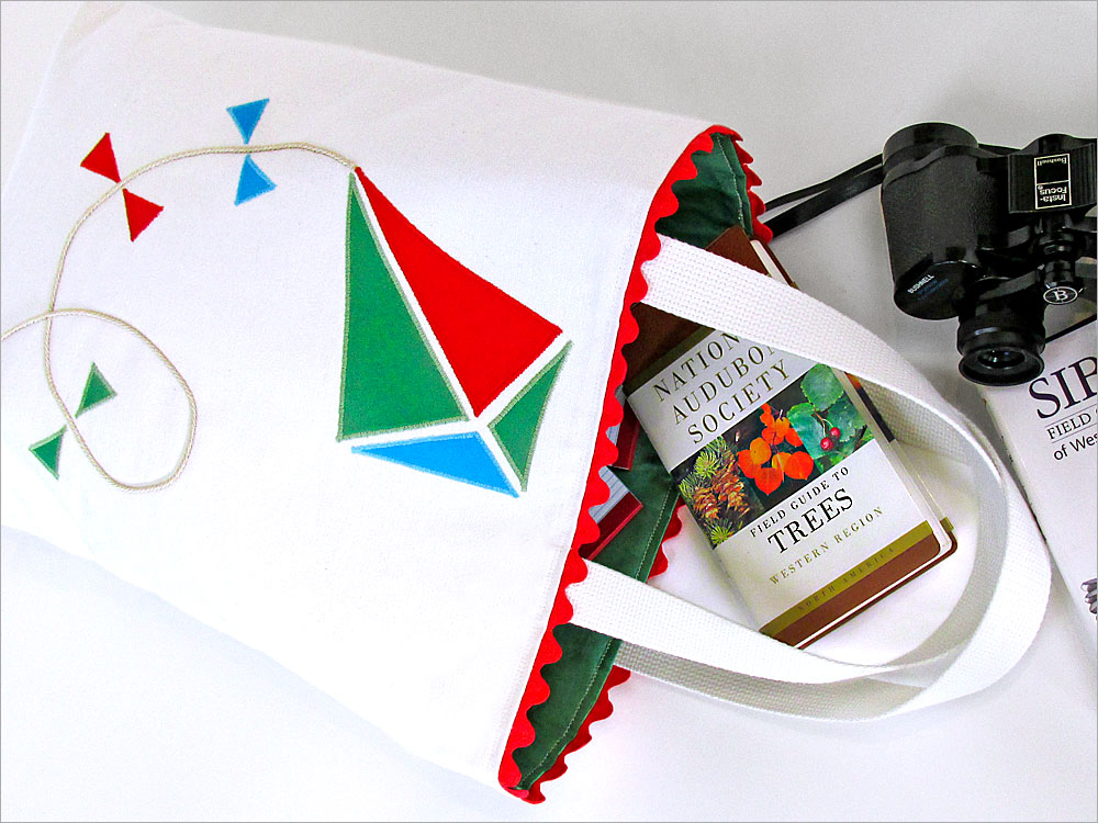 Let’s go fly a kite! This tote is ready to take off on your next adventure or at least on your next excursion to the store. The shopper style construction is fast and easy with deep 4″ boxed corners and no-sew webbing handles. Let your creativity soar with the fun front appliqué. We offer a template download for the kite’s body and tail, and show you two different presser feet that make quick work of this eye-catching embellishment.