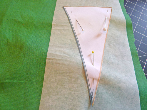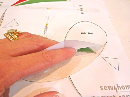 NOTE: We also cut out the triangles for the main kite body so the template would lay flat and line up perfectly. - Place the cut template into position on the front of the fabric panel.