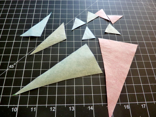 - From the fusible web, cut rectangles slightly larger than all the kite triangles needed for each solid color.