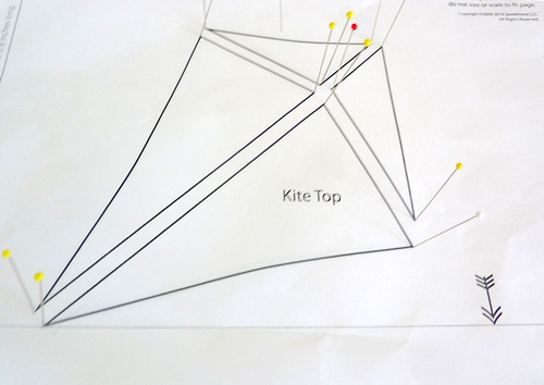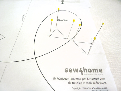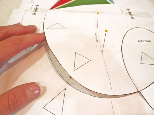 - Pin or tape the template to fabric panel to hold it in place. Then, insert a pin at the corners of each of the four triangles that make up the kite body.