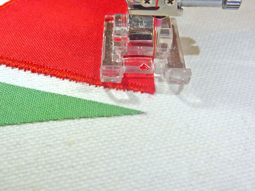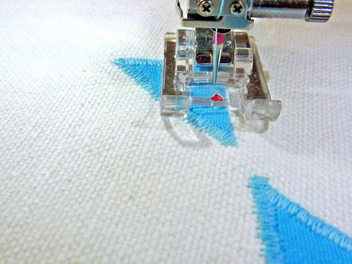 The Janome Satin Stitch foot is transparent so you can see your stitching and follow along a guide line. In addition, the bright red arrow at the front of the foot marks the center needle drop position. When doing appliqué, simply keep the point of that arrow on the edge of the fabric for a perfectly centered stitch.