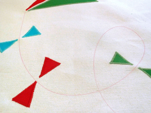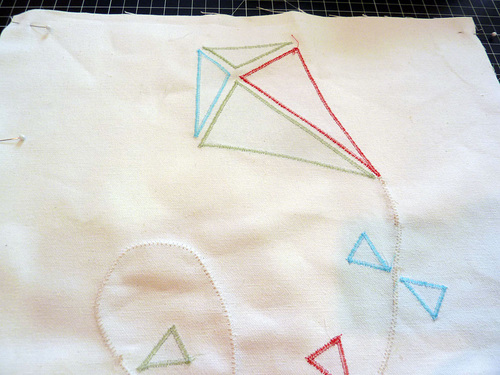 - Thread the machine, top and bobbin, with thread to match the first of the kite colors. To cut down on re-threading time, we stitched all the same colored triangles at once, then moved to the next color.