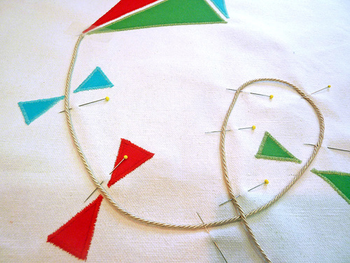 - Pin the thin cording in place, following the drawn line. Cut away any excess. We found it helpful to also place a small piece of tape at each end of the cording to help secure it.