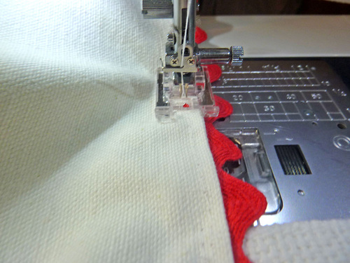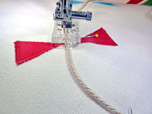 - No matter which type of foot you use, test your stitching on a scrap of fabric to insure your zig zag is correctly set and feeding easily. When stitching into place on the tote, go slowly and guide the cording on the line, removing the pins along the way. You’ll want to go especially slowly and carefully at the cross-over point of the loop. Also, start and end as close to the ends of the cording as possible.