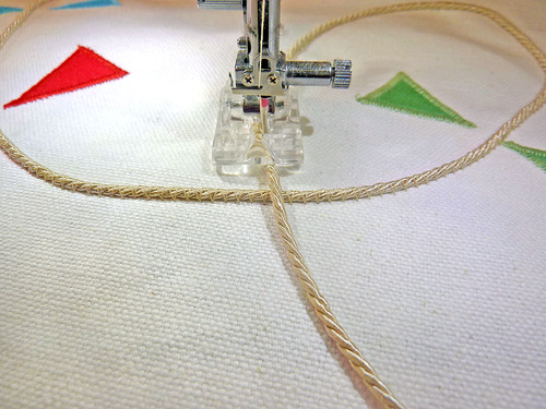 - If you don’t have this foot, you can use a regular presser foot. Set up your machine for a zig zag that hits to either side of the cording.