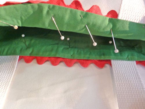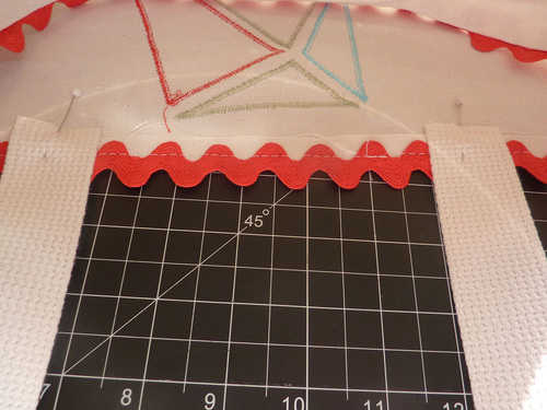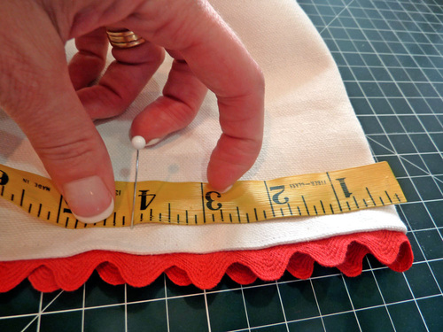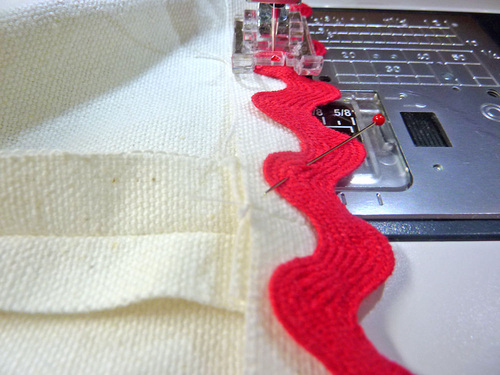 - Find the length of rick rack. Starting at one side seam, pin the rick to the inside of the folded edge. The center of the rick rack should run along the top folded edge so half of the rick rack’s “wave” is visible above the top edge of the tote. Pin in place and then machine baste in place.