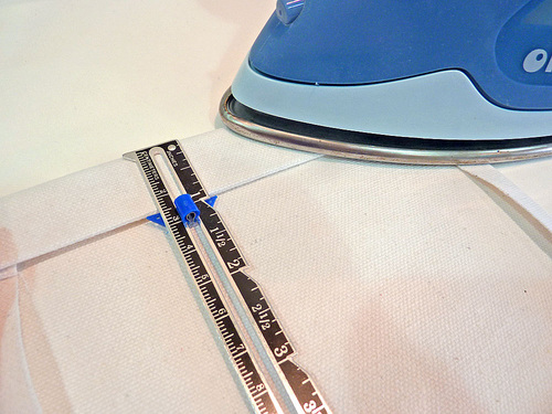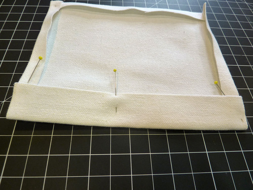 - Fold back the upper raw edge of the exterior bag ½” and press. Lightly pin to hold in place.
