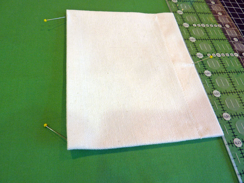 - Measure 4″ in from each side seam on both the front and back of the tote and place a pin.