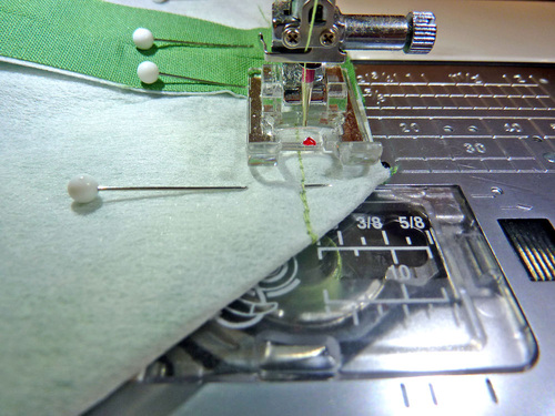 - Re-thread with thread to match the lining fabric. Stitch both sides and across the bottom, using a ½” seam allowance. Remember to pivot at the corners.