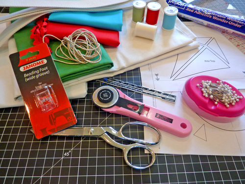 We used the Janome Beading foot to attach the kite’s looping tail. This foot option comes in two different sizes to handle various strung beads as well as cording. We used the wide option in the 9mm version, which accommodates 2.5 – 4mm. It allowed us to get a wonderfully smooth curve to our kite string.
