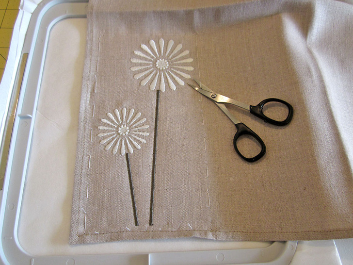 - Remove the basting stitches. Remove the excess stabilizer. Press flat from the wrong side.
