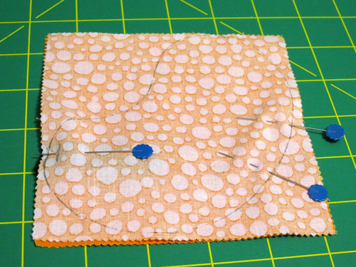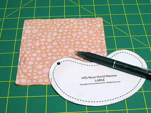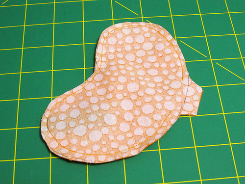 - Add two additional marking pins along the outer curve of the Jelly Bean about 2″ apart. These mark the opening that should be left for turning right side out and filling with rice.
