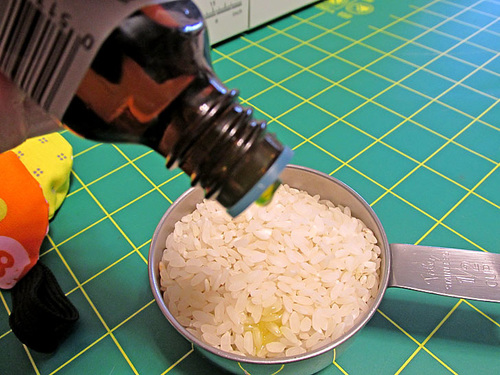 - In a small bowl or measuring cup, mix the ⅓ cup of rice with a few drops of essential oil and stir. We used just two drops of the orange oil we chose.